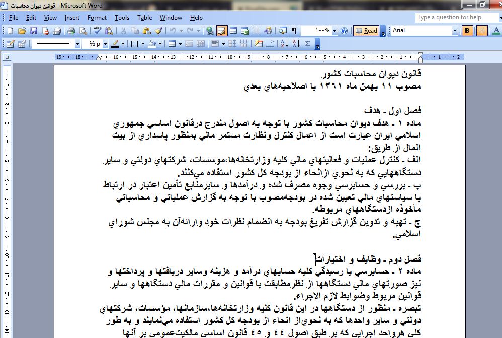 ماده ۱ ـ هدف ديوان محاسبات كشور با توجه به اصول مندرج درقانون اساسي جمهوري اسلامي ايران عبارت است از اعمال كنترل ونظارت مستمر مالي بمنظور پاسداري از بيت المال از طريق:
