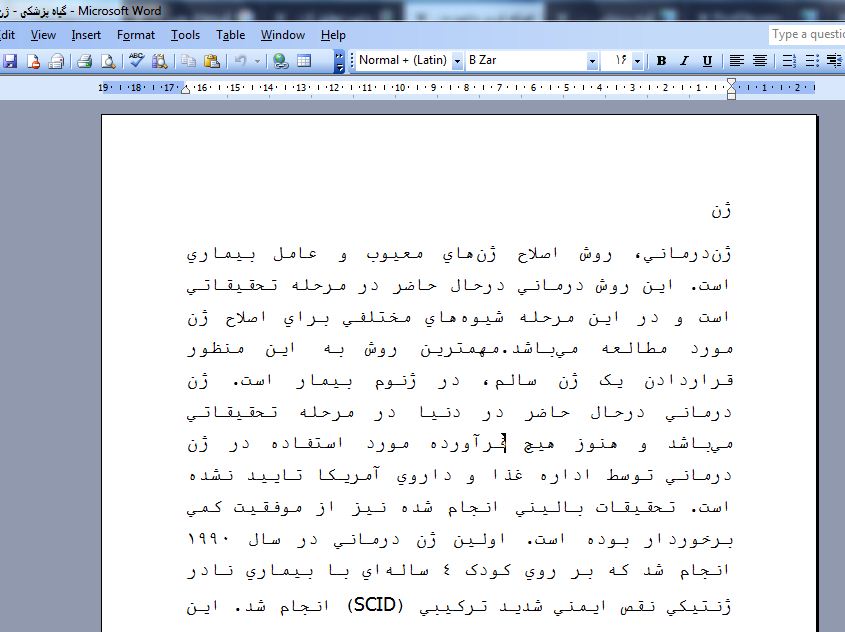 ژندرماني، روش اصلاح ژنهاي معيوب و عامل بيماري است. اين روش درماني درحال حاضر در مرحله تحقيقاتي است و در اين مرحله شيوههاي مختلفي براي اصلاح ژن مورد مطالعه ميباشد.مهمترين روش به اين منظور قراردادن يک ژن سالم، در ژنوم بيمار است. ژن درماني درحال حاضر در دنيا در مرحله تحقيقاتي ميباشد و هنوز هيچ فرآورده مورد استفاده در ژن درماني توسط اداره غذا و داروي آمريکا تاييد نشده ژندرماني بسيار اميدوارکننده به نظر ميرسيد ولي واقعيت امر اين است که به دليل پيچيدگي بيولوژيکي بيش از حد ژندرماني در انسان و نيز عدم شناخت کامل بسياري از بيماريهاي ژنتيکي امکان استفاده وسيع از ژندرماني در انسان ميسر نشده است. بحث ديگر بحث اخلاق پزشکي است و بايد توجه داشت که ژن درماني بر قرار گرفته به خوبي شناسايي شده باشند ۳)ژن سالم مورد نظر که قرار است به سلول شخص بيمار وارد شود قبلا جداسازي و کلون شده باشد ۴) ژن سالم قادر به ورود به تعداد زيادي سلول بافت مورد نظر باشد ۵)ژن به طور مناسبي قابل بيان (express) باشد ۶) روشهايي در دسترس باشد که بيخطر بودن آنها به اثبات رسيده باشد.بحثهاي زيادي در تاييد و يا رد ژندرماني وجود دارد. مهمترين موردي که در تاييد ژندرماني مطرح درباره ژندرماني نيستند و مزايا ومعايب آن را به درستي درک نميکنند. به طور خلاصه مواردي که در رد ژندرماني در سلولهاي جنسي مطرح هست شامل ۱) فقدان اطلاعات علمي کافي و خطرات باليني زياد آن و نيز ناشناخته بودن اثرات طولاني مدت اين نوع درمان ۲) چنين آزمايشاتي ممکن است در نهايت منجر به تشويق ساير محققين به کار بر روي تغيير ژنتيکي در افرادي که بيمار نميباشند شود ۳) به دليل آنکه ژندرماني در سلولهاي جنسي مستلزم استفاده از جنين است و در مولکول حامل ژن که وکتور ناميده ميشود براي انتقال ژن به سلول بيمار استفاده ميشود. يکي از مهمترين وکتورهاي مورد استفاده ويروسهاي دستکاري ژنتيکي شده ميباشند که قادر به حمل DNAانساني هستند. ويروسها توانايي انتقال ژنهاي خود به سلولهاي انساني و در نتيجه ايجاد بيماري را دارند که محققين از همين خاصيت استفاده کرده و ژنهاي مورد نظر به سلولهاي انساني را به کمک ويروسها منتقل ميکنند. معمولا سلولهاي هدف در شخص بيمار توسط ويروسهاي حامل ژن مورد نظر آلوده ميشوند که در فرصت پيدا ميکند، در سلول به قسمت هسته محلي که ژن در آن مستقر است برسد و بيان شود بيان عبارت است از اکسپرس شدن يعني در زمينه کاري که بايد انجام دهد، شروع به فعاليت کند. مادر اين زمينه پليمري ساختيم از ترکيب پلياتيلن ايميل و دگسترانت اين پليمر توانسته است بيش از ۳۵ درصد سلولهاي حيواني به ژن مربوطه را بيان کند، درحالي که در روشهاي قبل از اين اقدام معمولا ۱۰ درصد سلولها بيان ميشد. مراحل مقدماتي اين پژوهش انجام شده است و اقدامات تکميلي آن در کشور در قالب طرحهاي پژوهشي انجام