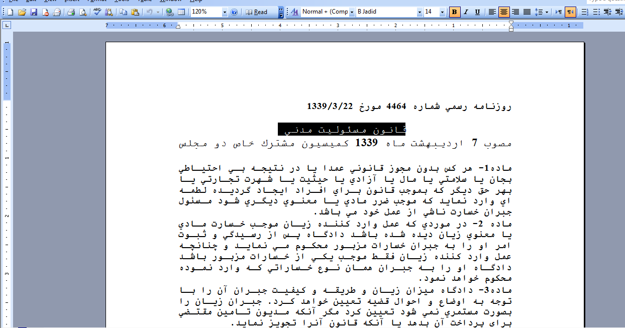 ماده۷- كسي كه نگاهداري يا مواظبت مجنون يا صغير قانونا يا برحسب قرار داد بعهده او مي باشد در صورت تقصير در نگاهداري يا مواظبت مسئول جبران زيان وارده از ناحيه مجنون يا صغير مي باشد و در صورتيكه استطاعت جبران تمام يا قسمتي از زيان وارده را…