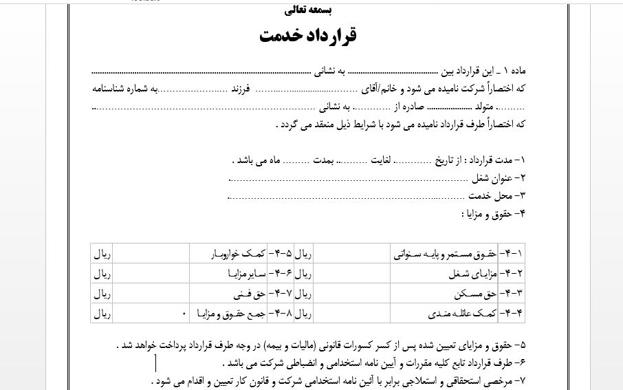 نمونه فرم قرارداد خدمت