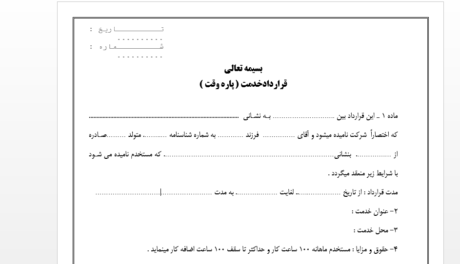 ماده ۱ ـ اين قرارداد بين ……………………….. به نشاني …………………………………………………………………………………….. كه اختصاراً شركت ناميده ميشود و آقاي …………… فرزند …………به شماره شناسنامه ……..…. متولد ………صادره از ………….…. بنشاني……………………………………………………………………. كه مستخدم ناميده مي شود با شرايط زير منعقد ميگردد .
